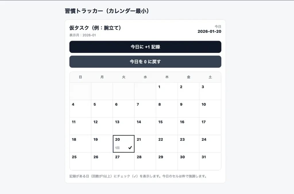 今回は、ラジオ体操のスタンプカードのように、継続している習慣の成果をカレンダーで振り返ることができる習慣トラッカーアプリを作成します。